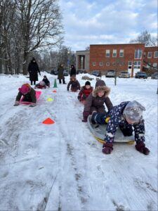 Õues tegutses õhinal kogu lasteaiapere. Meie kõige nooremad lapsed ehk Liblika hoiurühm tegutses põhiliselt kelgumäel. Lapsed õppisid ohutut liiklemist – mäest alla sõideti kindlal kelgusõidualal ja kelk veeti üles mäele mööda kõnnirada. Kes suutis, lükkas kelgul istudes ka kätega hoogu ning koos sõbraga kelgutades tuli liug pikem. Tasakaalu harjutati nii mäkke ronides kui kelgul püsides ja eriti tore oli pärast liugu end kelgult lumme keerata. Aiarühmade lapsed panid end lustiga proovile viies arendavas liikumispunktis: kelguga mäest laskudes käega tähiste puudutamine; kelgu kätega edasitõmbamine kõhuli; sõbra vedamine kelgul; terakotivisked puutüvele nöörtähiste pihta; talihoki takistusrajal palli juhtimine hokikepiga. Õuest tuppa minnes olid lastel põsed punased, keha soe ja meel rõõmus – just nii sünnivadki head liikumisharjumused kogu eluks.