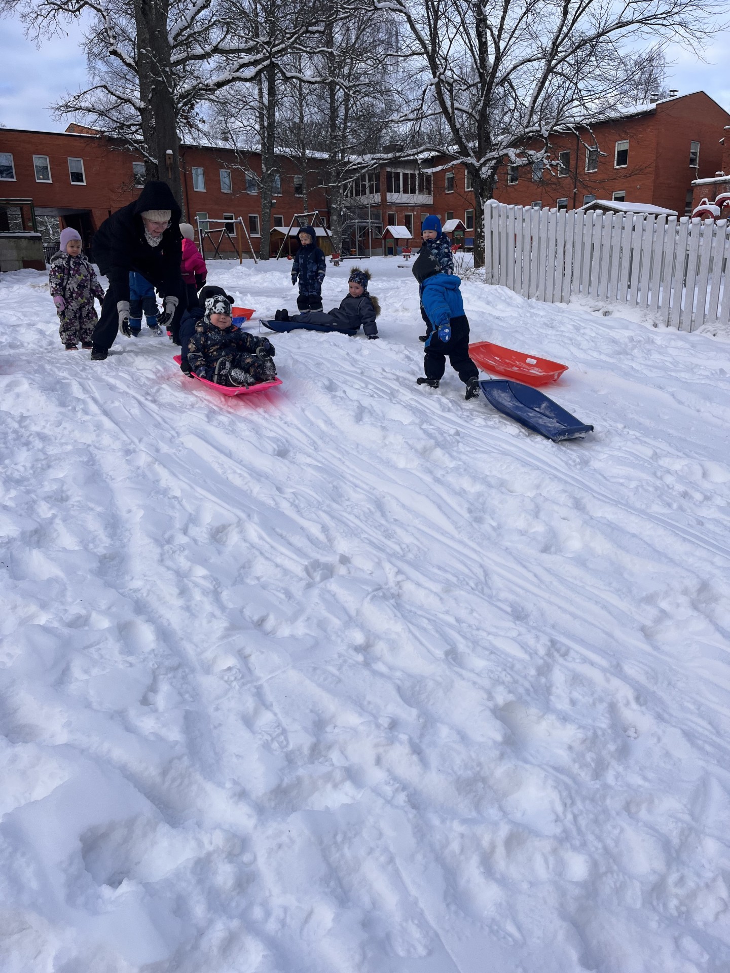Õues tegutses õhinal kogu lasteaiapere. Meie kõige nooremad lapsed ehk Liblika hoiurühm tegutses põhiliselt kelgumäel. Lapsed õppisid ohutut liiklemist – mäest alla sõideti kindlal kelgusõidualal ja kelk veeti üles mäele mööda kõnnirada. Kes suutis, lükkas kelgul istudes ka kätega hoogu ning koos sõbraga kelgutades tuli liug pikem. Tasakaalu harjutati nii mäkke ronides kui kelgul püsides ja eriti tore oli pärast liugu end kelgult lumme keerata. Aiarühmade lapsed panid end lustiga proovile viies arendavas liikumispunktis: kelguga mäest laskudes käega tähiste puudutamine; kelgu kätega edasitõmbamine kõhuli; sõbra vedamine kelgul; terakotivisked puutüvele nöörtähiste pihta; talihoki takistusrajal palli juhtimine hokikepiga. Õuest tuppa minnes olid lastel põsed punased, keha soe ja meel rõõmus – just nii sünnivadki head liikumisharjumused kogu eluks.